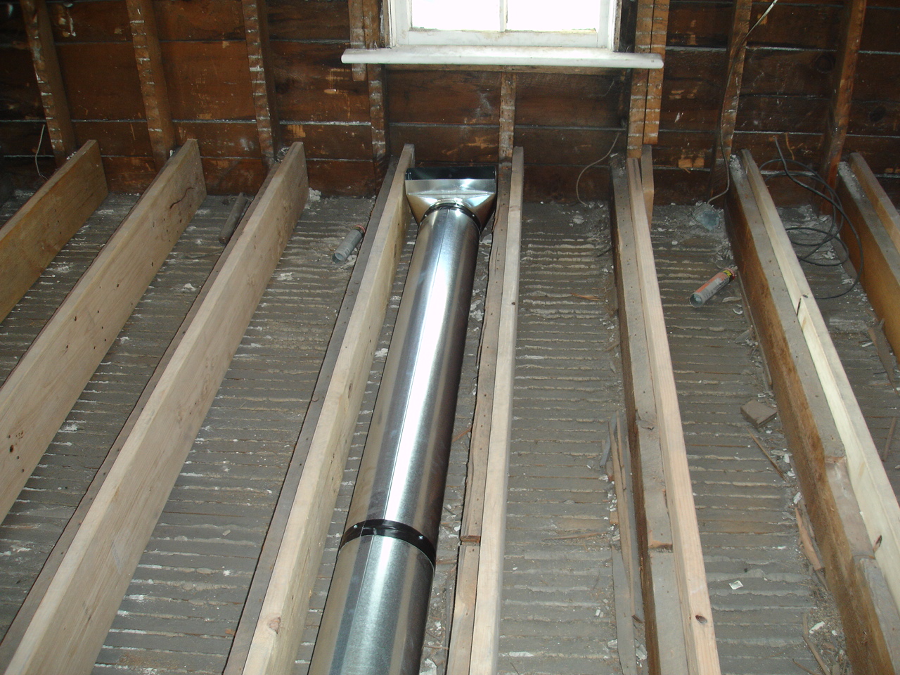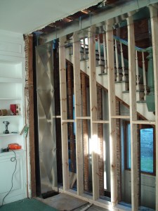 Then I had my heating and cooling guy run new vent pipes to heat that section and also put in cold air returns. With that completed I hauled 15 4×8 sheets of tongue and groove floor boards upstairs and installed them over the new floor joists. I was pretty proud of all of that spent some time doing my “Tim the Toolman” imitation and admiring all my work. With then new floor in I have been able to build new stud walls in that section for two bedrooms and closets. The smell of new wood is much better than all the dirt I’ve been breathing during the demolition phases
