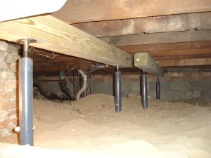 I jacked up the main floor under the living room and the kitchen and repaired the cut and broken floor joists. Then I built a new bearing wall in the living room so we can put in new and bigger stairs.