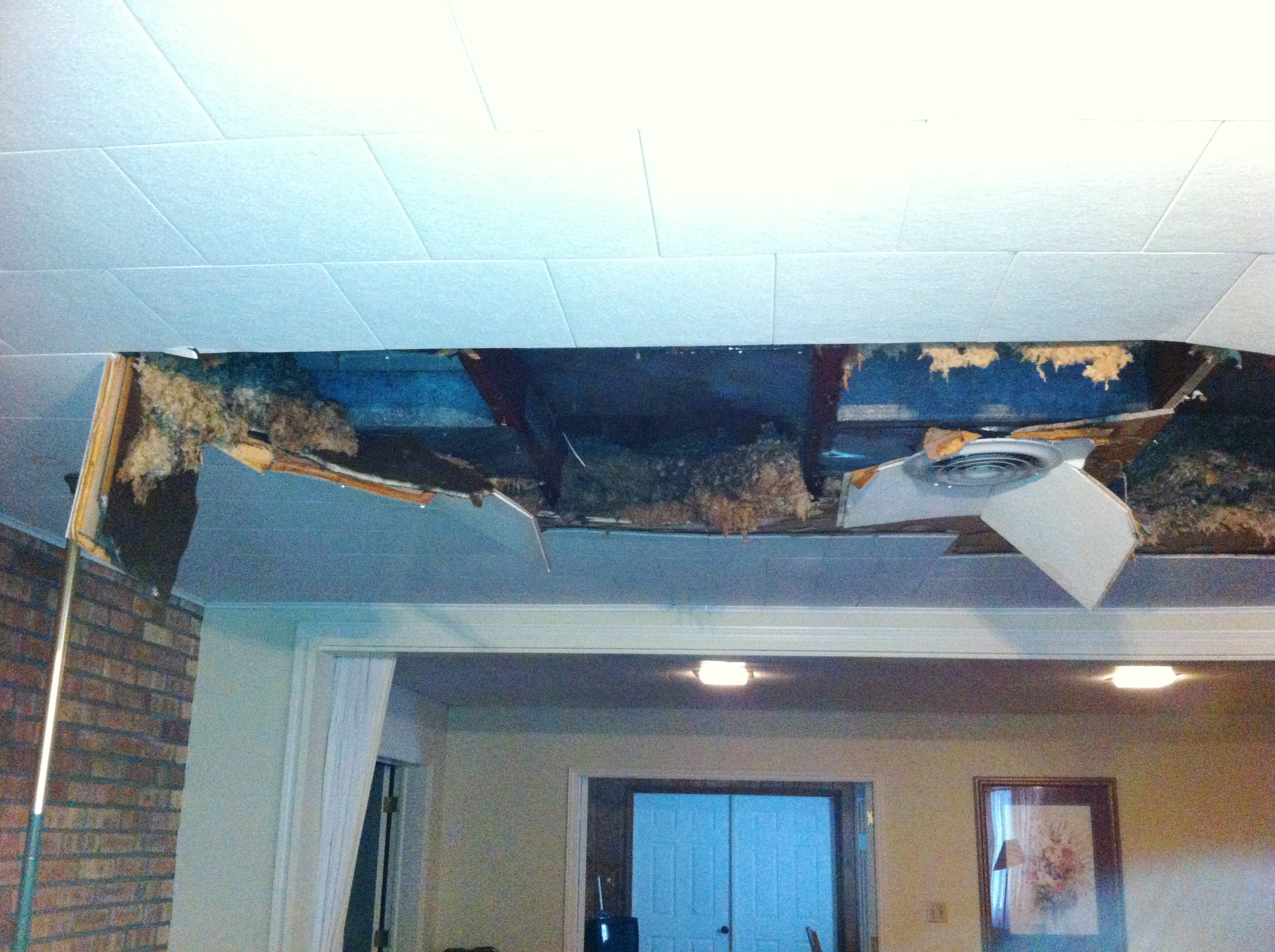 Three days later our parking lot snowplow guy was clearing the snow and called us to say there was water running out from under the door. Not the kind of news you want to hear. What had happened was that the water pipes that run through the ceiling had frozen and cracked during the cold snap when the furnace wasn’t working. And when we turned the furnace back on it thawed out the pipes and the water started spraying water in the attic space above the ceiling. It eventually soaked the drywall and tiles and the ceiling came crashing down on the furniture. The water then continued to run for 3 days before it was discovered. Here are some pictures.